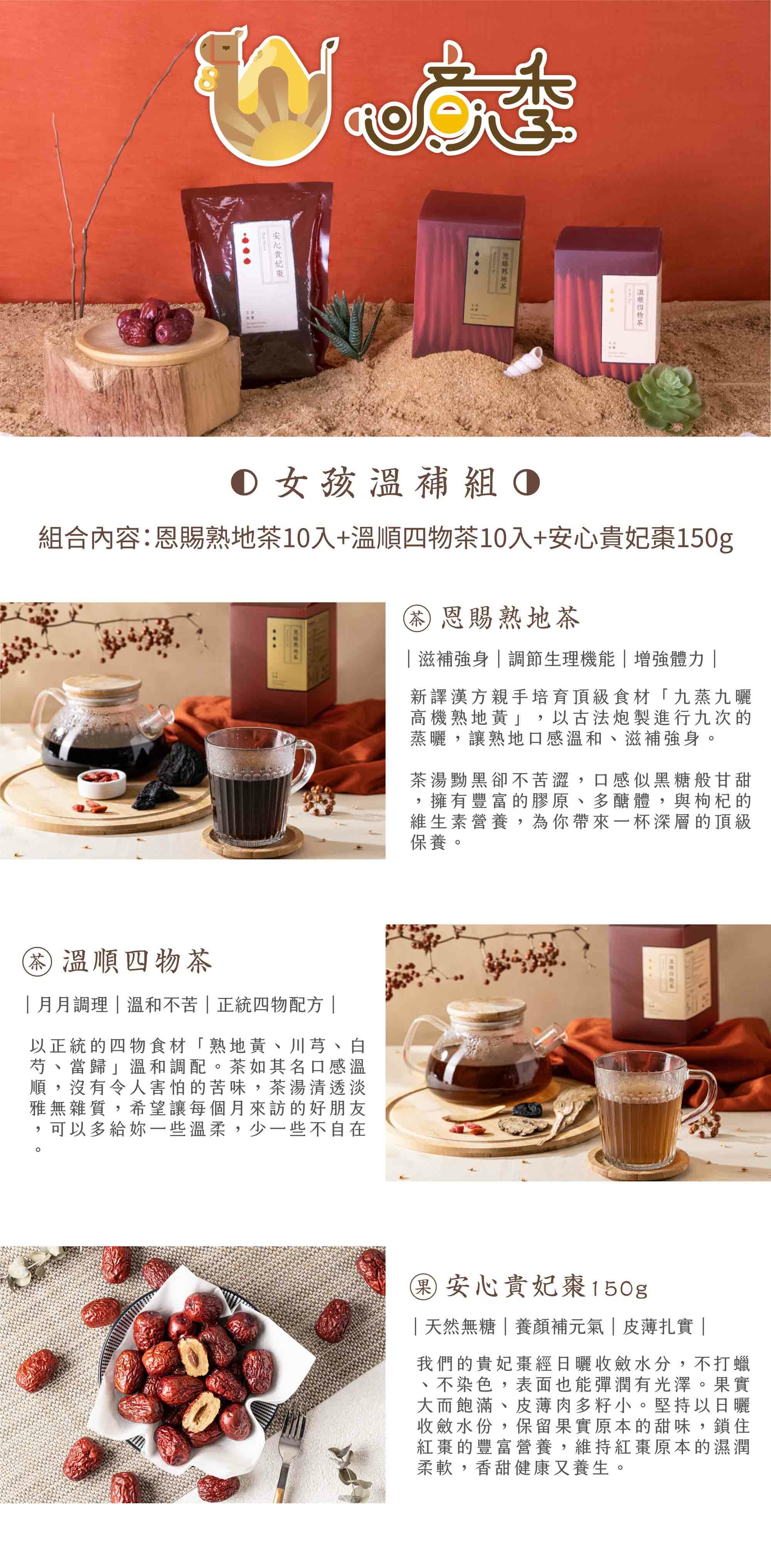 ‧ 組合內容:溫順四物茶10入+恩賜熟地茶10入+安心貴妃棗150g