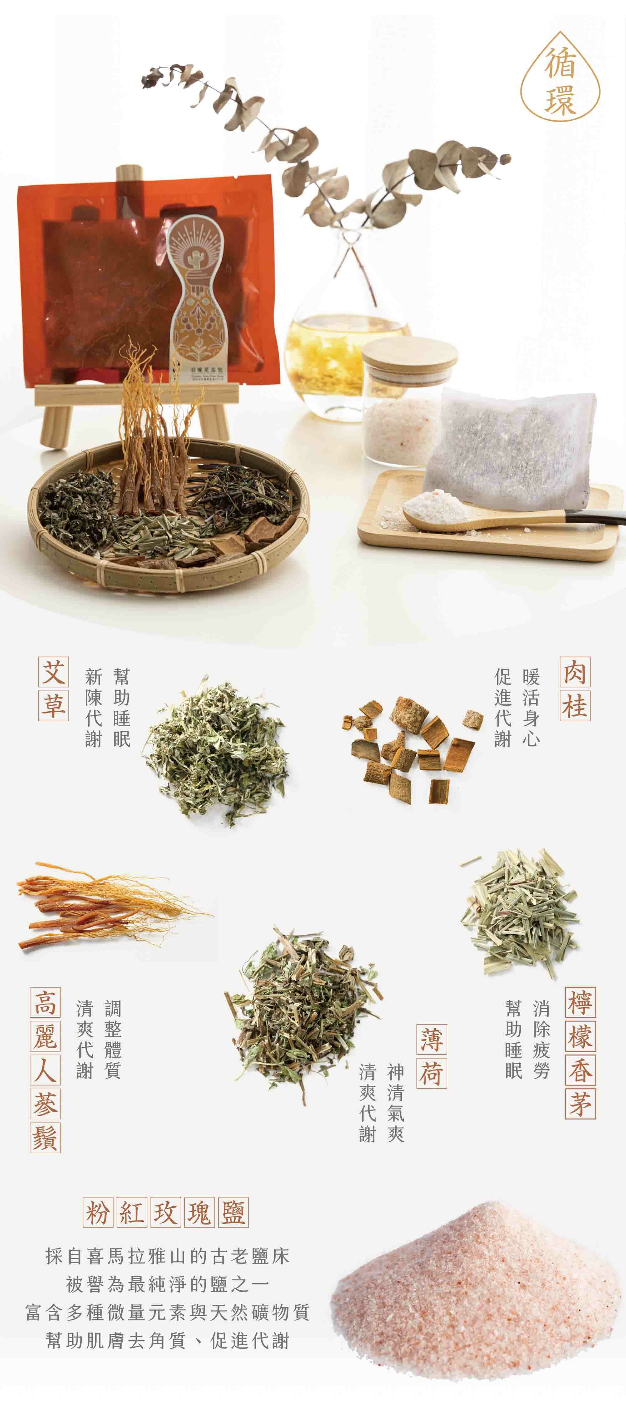 ‧ 特選「喜瑪拉雅山粉紅鹽、高麗人蔘鬚、桂皮、艾草」草本