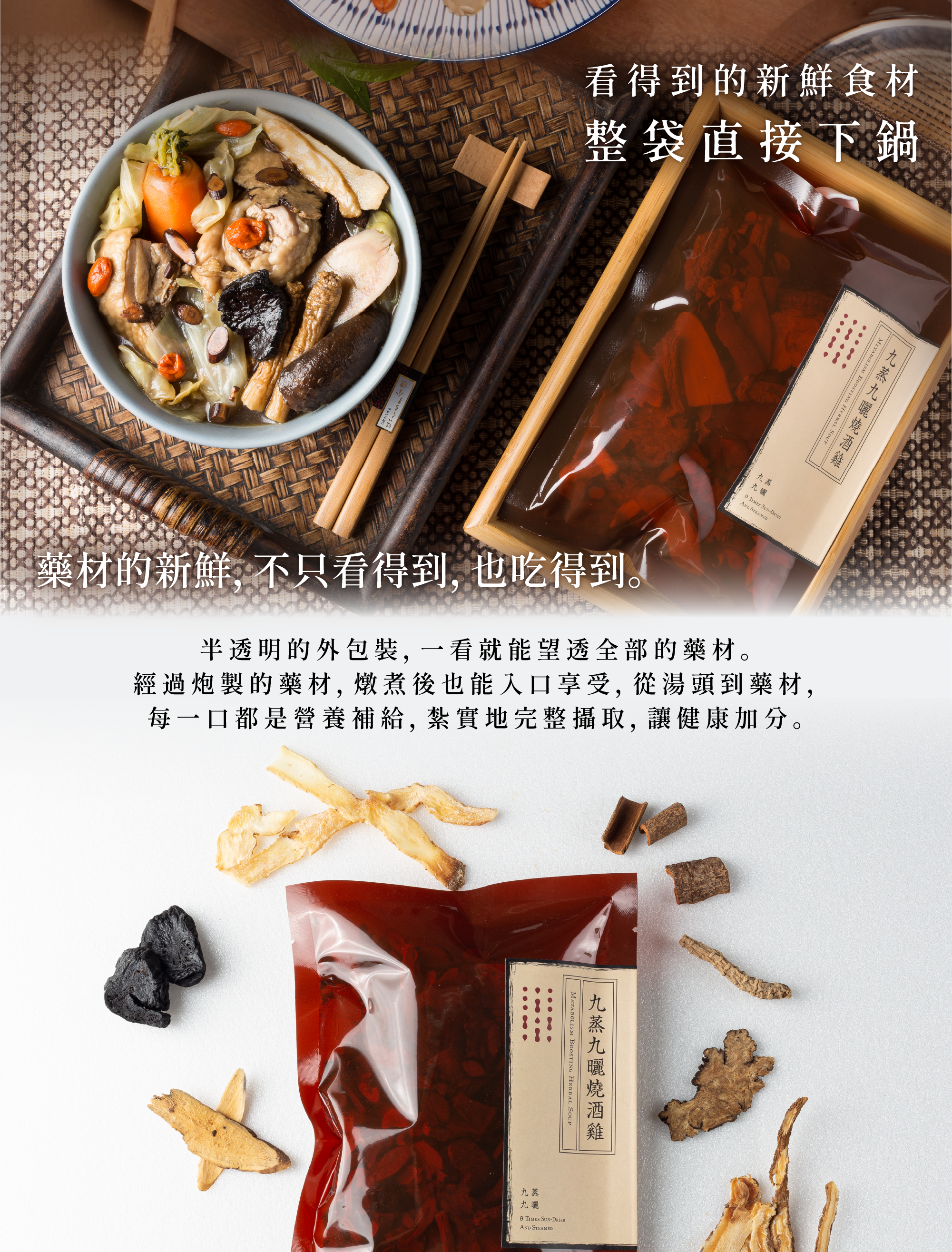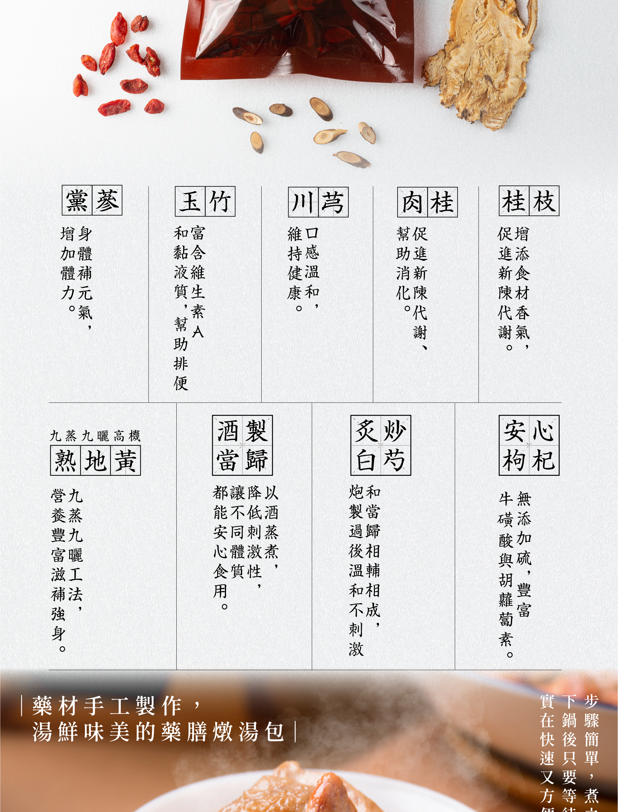 我們堅持手工古法炮製,使每一味食材溫和美味,讓漢方輕鬆走入你的日常,展現自然光彩。