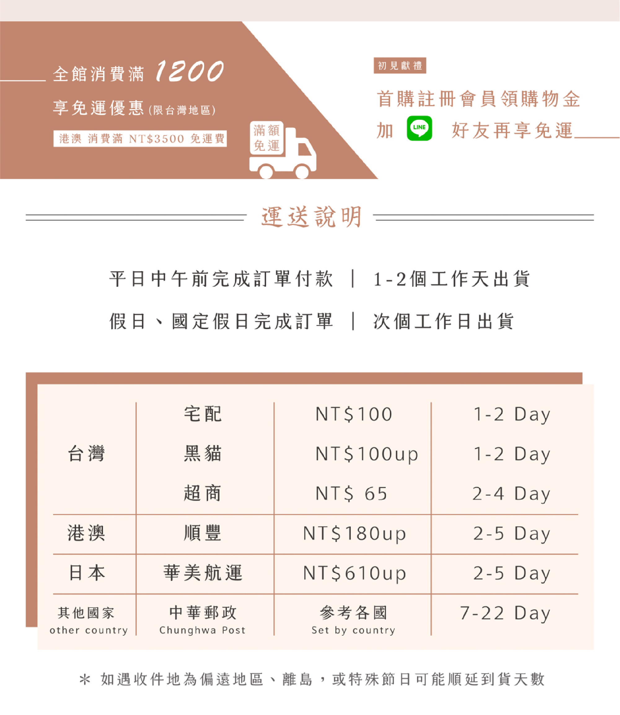 全店,台灣地區滿 1,200 免運費