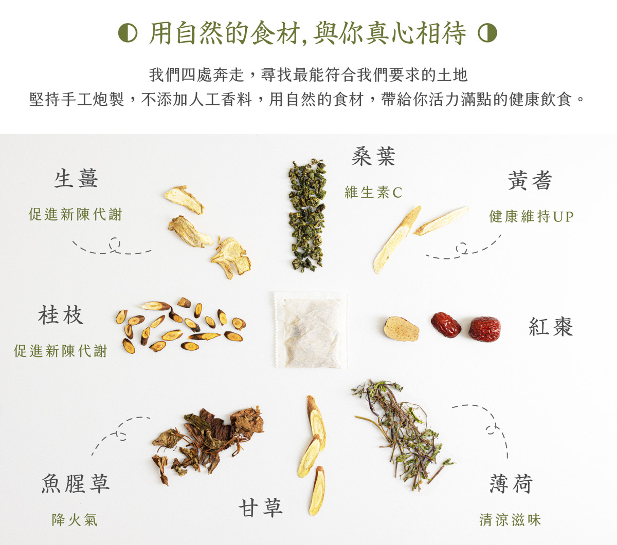 選用「魚腥草、桑葉、黃耆、薄荷」四大漢方,手工研磨放入四角棉袋,甘潤清香的滋味,幫助滋補強身、清涼潤喉。